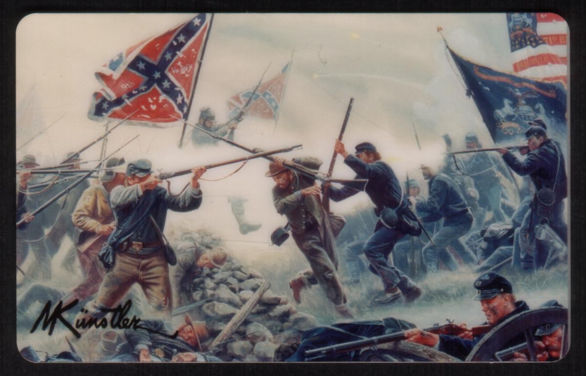 The artist's signature, "M. Kunstler," is visible in the lower left corner of the card. This world card, designated as USED - MT by WorldCom, highlights American history with a militaristic and western theme centered on Civil War battles, guns, and American and Confederate flags. The artwork epitomizes Americana and captures a significant moment in U.S. military history with great attention to detail.