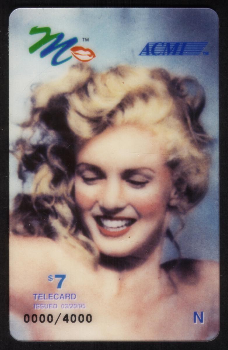 This collectible phone card features a portrait of Marilyn Monroe with a warm smile, her blonde curls softly framing her face against a gently blurred background. The card prominently displays the logos of "ACMI" and one with a stylized green, blue, and red design including a red lip symbol near the top.
