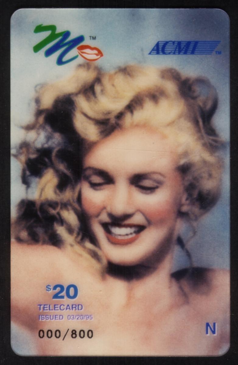 The card is marked with "$20" indicating its value and labeled as a "TELECARD" with an issue date of "03/20/95." It is part of a limited edition, numbered "000/800," emphasizing its collectibility. The top right corner displays the "ACMI" logo, a known telecommunications company, while the top left corner features a stylized "M" logo with a red lipstick kiss mark, likely referencing Marilyn Monroe.