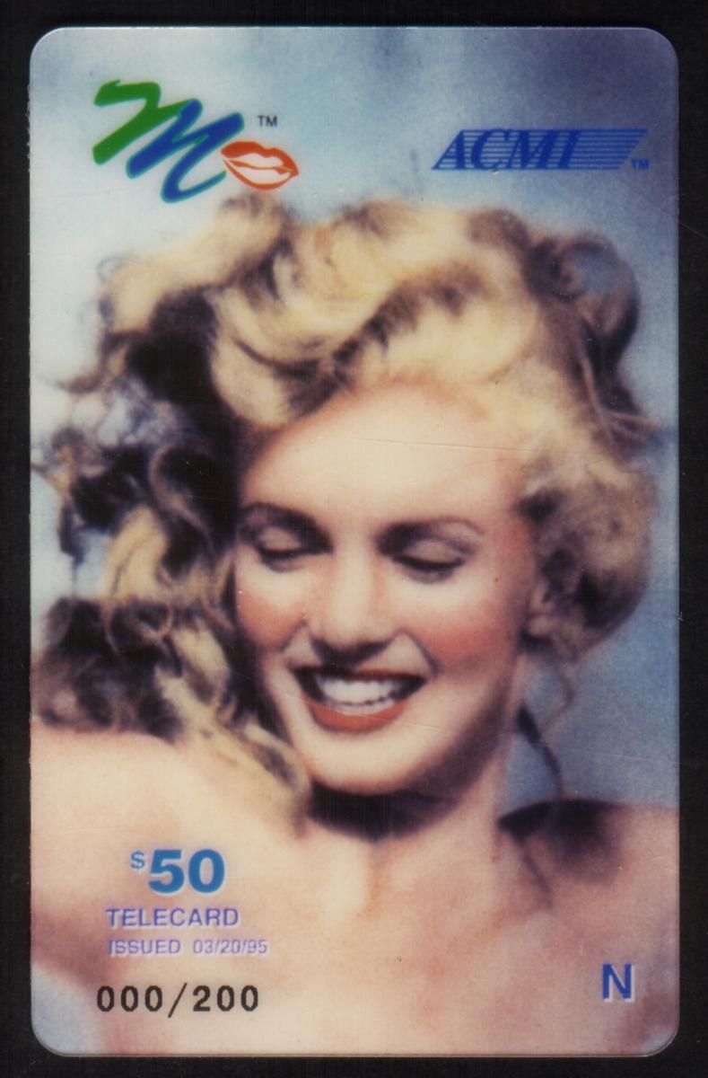 In the upper right corner, the logo “ACMI” is present in blue, while the upper left corner bears a stylized “m” logo accented by red lips. The card includes a blue letter “N” in the bottom right corner, marking it as a specimen version. This Marilyn Monroe phone card was produced as part of a collectible series honoring famous celebrities and movie stars from Hollywood, emphasizing her status as a legendary actress.