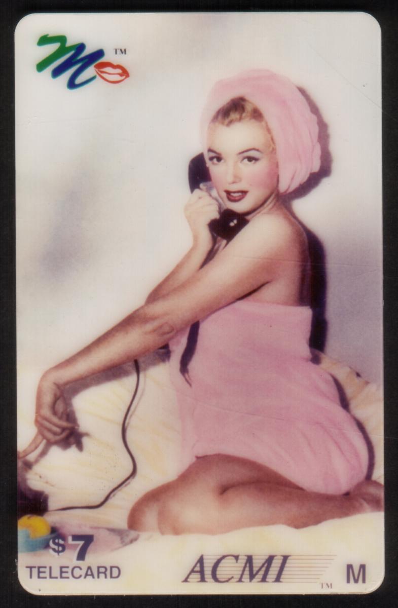 The phone card is valued at $7 and is marked with "TELECARD" at the bottom left. The card also includes the acronym "ACMI" centered near the bottom, accompanied by the letter "M" on the lower right side. In the top left corner, a stylized "m" logo is present, featuring a small red lip graphic next to the letter. This card has a clean and classic design highlighting Marilyn Monroe's iconic image in a glamorous and intimate pose.