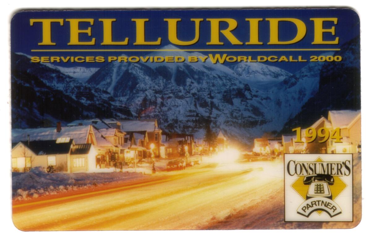 This phone card emphasizes travel, tourism, and the picturesque qualities of Telluride, Colorado, celebrating its heritage as a scenic mountain town and popular destination. The card was issued in 1994 and is associated with WorldCall 2000 services.