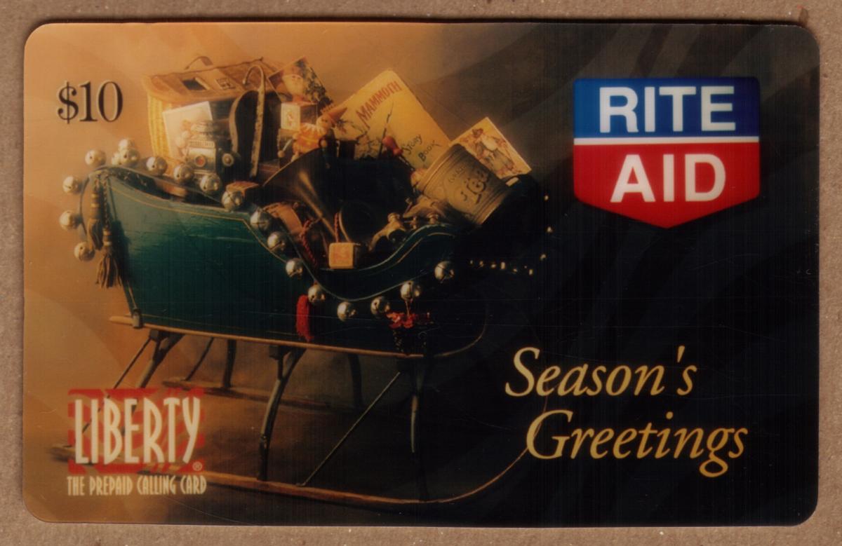 Vintage holiday scene with a green sleigh, gifts, ornaments, and the Rite Aid logo; features Liberty prepaid calling card with a $10 value. |