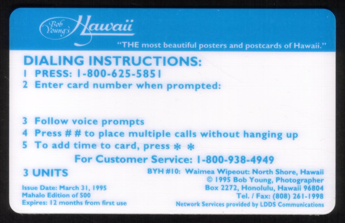 This phone card is part of Bob Young's Hawaii: Waimea Wipeout series, showcasing expert surfing moments on the North Shore, a world-renowned surfing destination in Hawaii. The overall design centers on the dynamic energy of wipeouts and wave riding, celebrating Hawaii’s iconic surf culture.