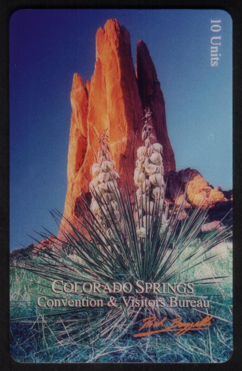 This collectible phone card features a scenic view of Colorado Springs, Colorado, showcasing distinctive tall reddish rock formations set against a clear blue sky. Prominently displayed in the foreground are flowering plants with long green leaves and white blooms, adding a natural floral element to the mountain scenery.