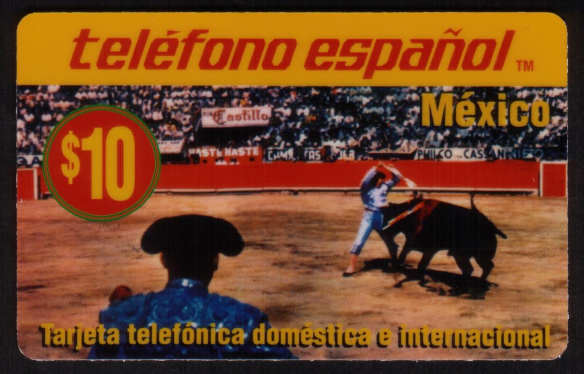 The card has a yellow header with the text "teléfono español" in red and "México" in bold black letters. A bright red and gold circle near the top-left corner prominently displays the value "$10." Along the bottom of the card, the phrase "Tarjeta telefónica doméstica e internacional" indicates that this card functions for both domestic and international telephone use in Mexico.