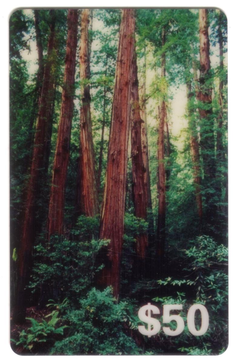In the lower right corner, the card prominently displays a white "$50" denomination, indicating the card’s value. The card is associated with Davel Communications Group and Phone Zone Inc, as indicated by the keywords. The design emphasizes a natural and serene forest landscape, symbolizing possibly the dense or untouched nature referenced by "Dense Forest SPECIMEN" in the keywords. The card balances natural imagery with clear monetary and brand information for use in telecommunications.