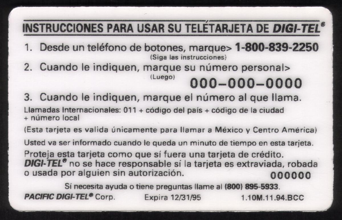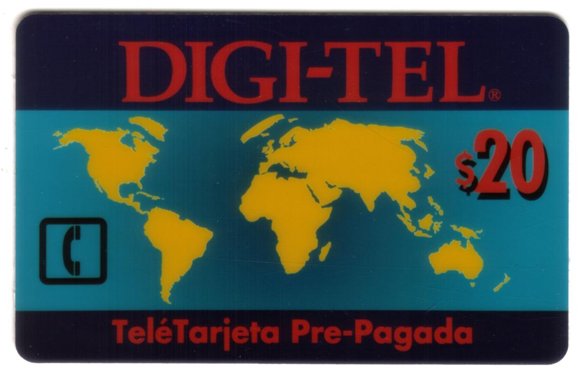 This Digi-Tel prepaid phone card is associated with the DIGITEL brand and the telecommunication service it offers, featuring a monetary value of 20 Spanish units for calling credit, suitable for use in prepaid telephony services.