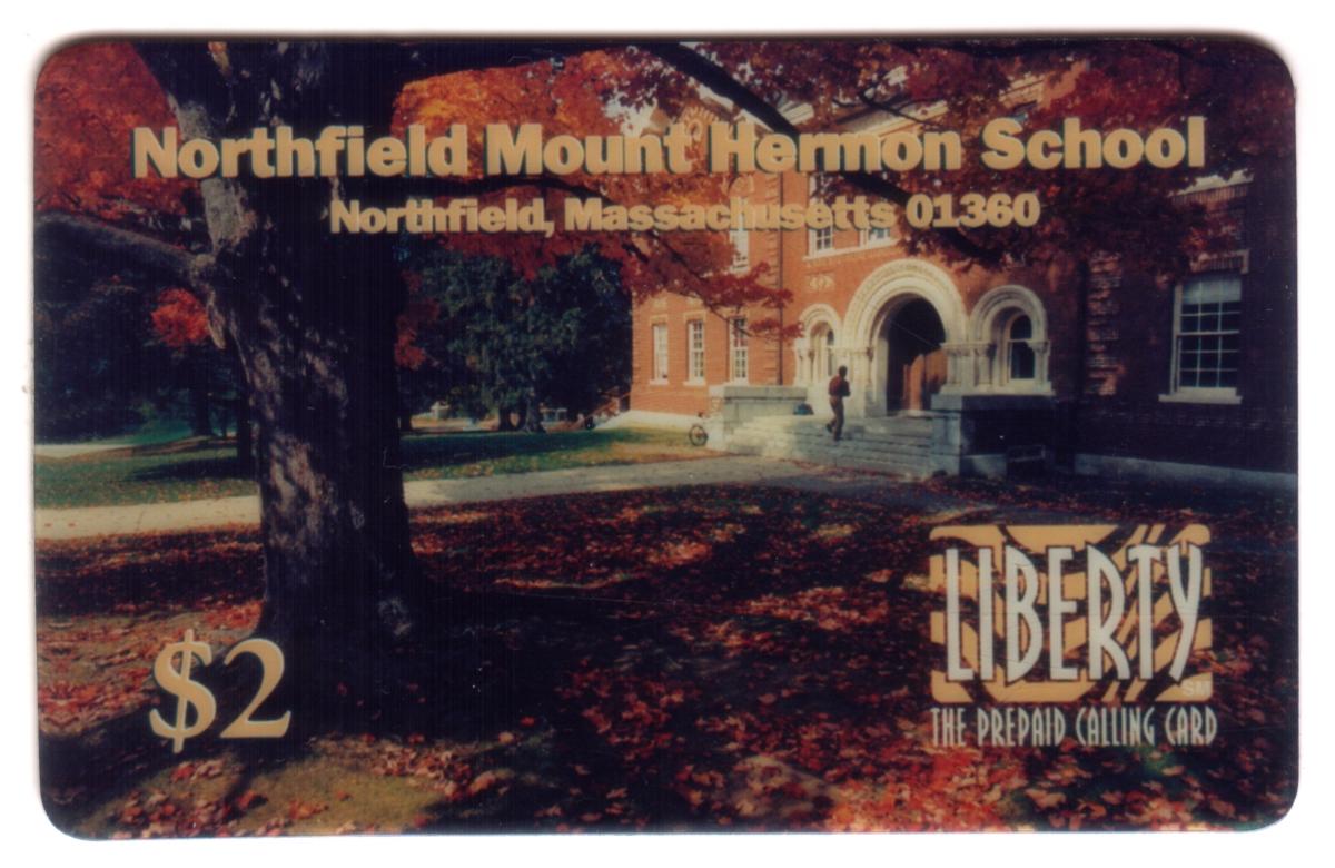 The card displays a denomination of $2 in gold lettering on the lower left corner. On the lower right, the word "LIBERTY" appears prominently in stylized letters, with "THE PREPAID CALLING CARD" printed beneath it. The school name "Northfield Mount Hermon School" is printed in large gold letters across the top of the card, with the location "Northfield, Massachusetts 01360" centered directly below it.