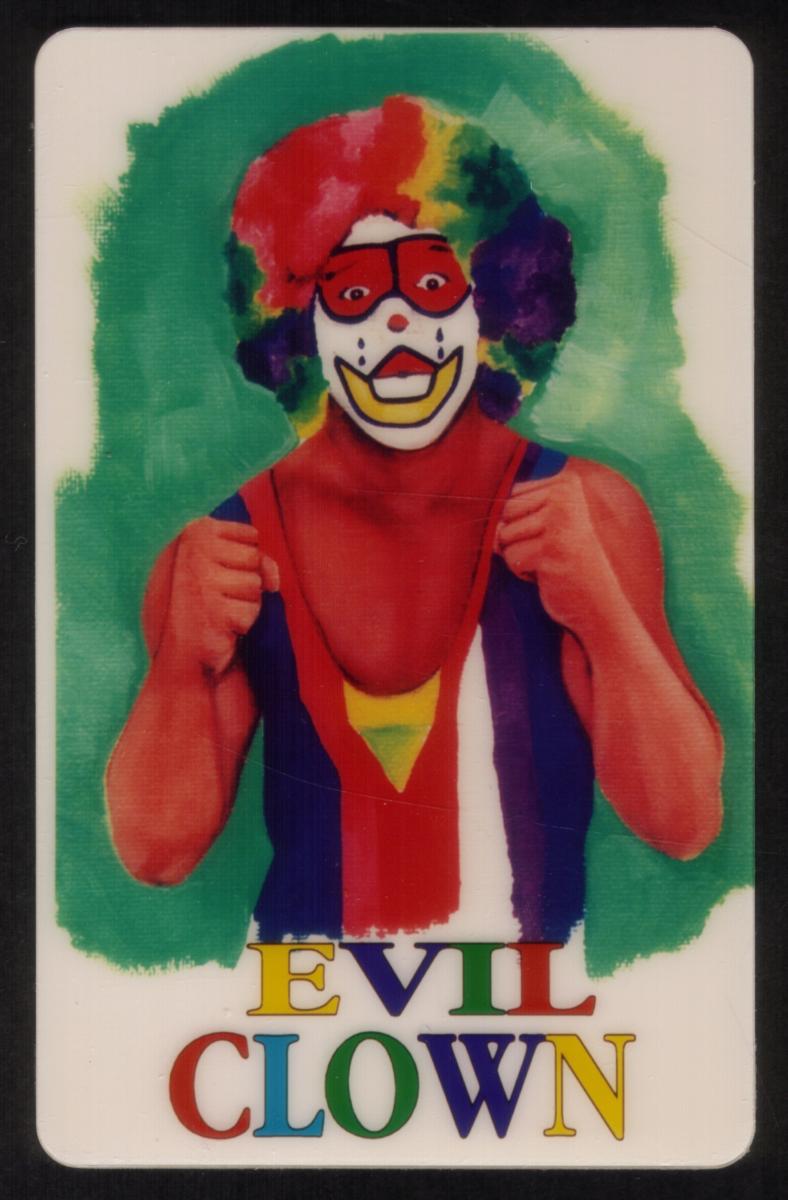 Below the clown figure, the colorful words "EVIL CLOWN" appear in large letters, each letter a different color, directly identifying the theme of the card. The card is labeled as a SPECIMEN and is part of the Global Telecom Network, indicating its use within a telecommunications context.