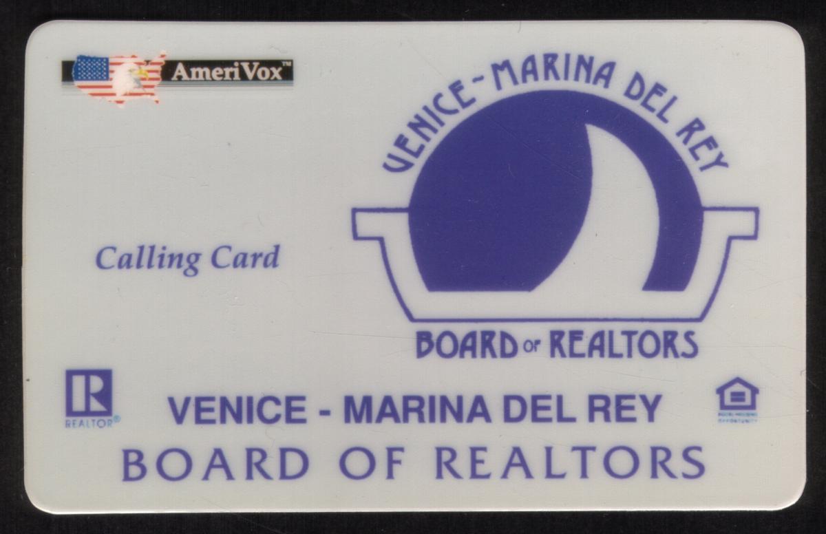 This collectible calling card is issued by AmeriVox and prominently features the branding for the Venice - Marina Del Rey Board of Realtors. The front of the card has a white background with a blue tinge, consistent with real estate themes. The central graphic is a stylized logo depicting a crescent-shaped sail or wave inside a boat silhouette, encircled by the text "VENICE - MARINA DEL REY" at the top and "BOARD OF REALTORS" below the emblem.