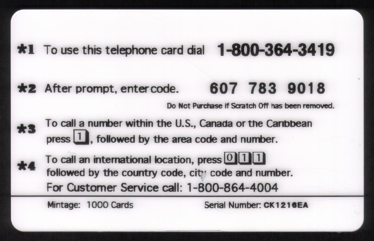 Since we have the world's largest inventory of USA phonecards for collectors, you will not necessarily receive the identical serial/batch/PIN number that we have scanned/pictured.
