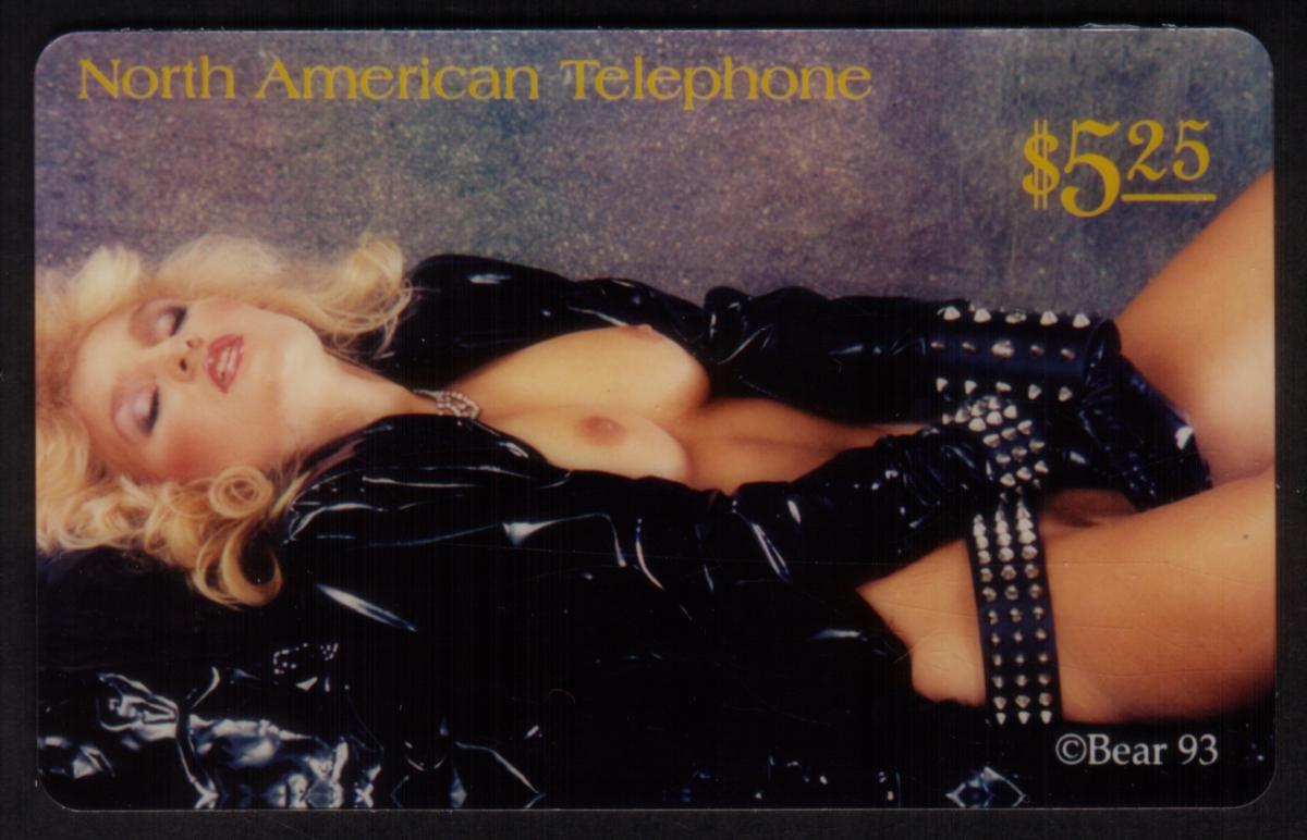 This collectible phone card features a nude blonde woman reclining against a muted, textured background. She has curly blonde hair styled loosely around her face and is wearing a black, shiny, studded jacket that is open, revealing her bare chest. The woman poses with both hands positioned near her crotch area, emphasizing a provocative stance. The photography is credited to Bear and dated ’93, visible in white text on the lower right of the card.