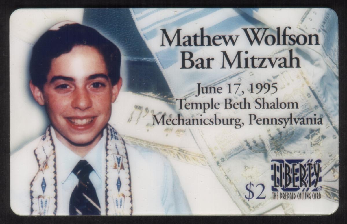 The card text states: "Mathew Wolfson Bar Mitzvah, June 17, 1995, Temple Beth Shalom, Mechanicsburg, Pennsylvania." The card holds a denomination of $2. In the bottom right corner, the Liberty logo appears with the words "THE PREPAID CALLING CARD."