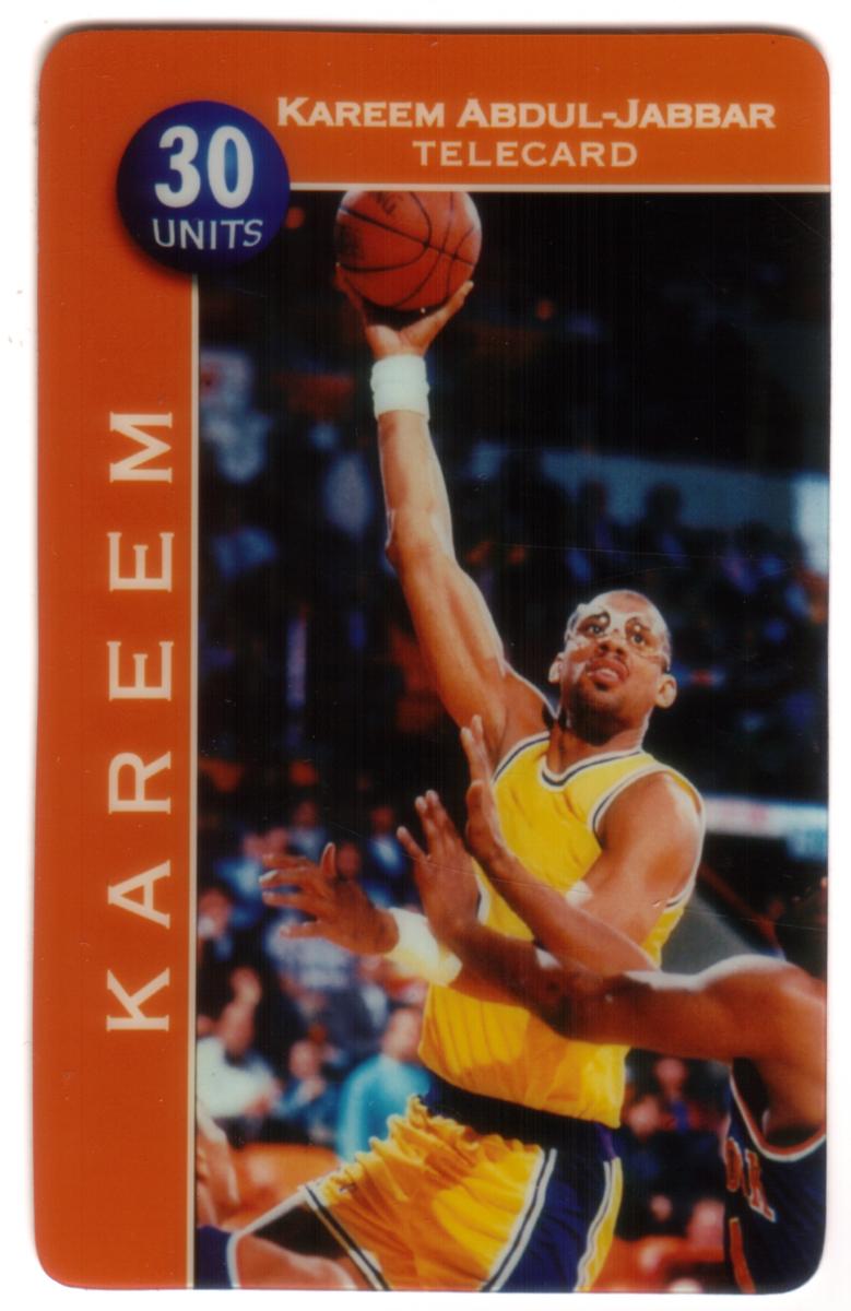 This telecard honors Kareem Abdul-Jabbar, a basketball immortal enshrined on May 15, 1995, with a focus on his legendary sports career. The dynamic action photo and the bright color scheme make it a distinctive collectible for basketball fans.