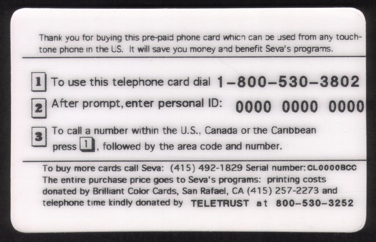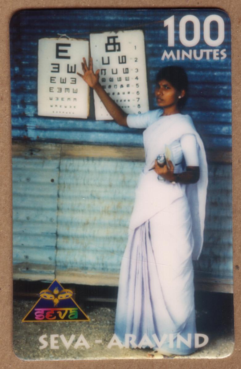 This phone card relates to the Seva Foundation and Aravind Eye Care system, organizations known for social activism, medical care, and community service focused on relieving suffering, blindness prevention, and eye health education. The imagery and branding connect specifically to the work of Seva Foundation and Aravind, prominent in regions such as Guatemala, Mexico, and India, known for their efforts in blindness prevention and diabetes awareness.