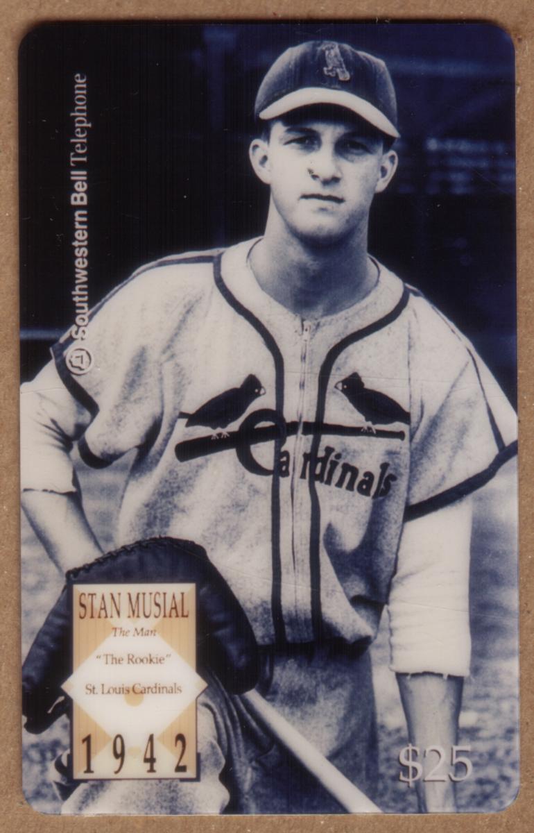 On the lower left of the card, there is a distinctive home plate-shaped emblem with the text: "STAN MUSIAL" at the top, followed by the nickname "The Man" and the phrase "'The Rookie' St. Louis Cardinals." Below this, the year "1942" is boldly printed in black. The value of the card, "$25," is printed in white in the bottom right corner. Along the left vertical edge of the card is the logo and name "Southwestern Bell Telephone," identifying the issuing company of the phone card.