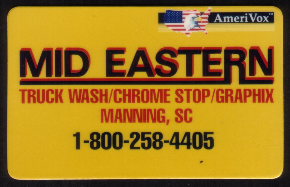 This collectible phone card features a bright yellow background with bold lettering and includes promotional information for Mid Eastern Truck Wash, Chrome Stop, and Graphix located in Manning, South Carolina. The text is centered on the card and is presented in contrasting colors: "MID EASTERN" is in large, bold red letters with a black shadow effect, while the details "TRUCK WASH/CHROME STOP/GRAPHIX" and "MANNING, SC" appear below it in red. At the bottom of the card, the toll-free phone number "1-800-258-4405" is printed in bold black font.