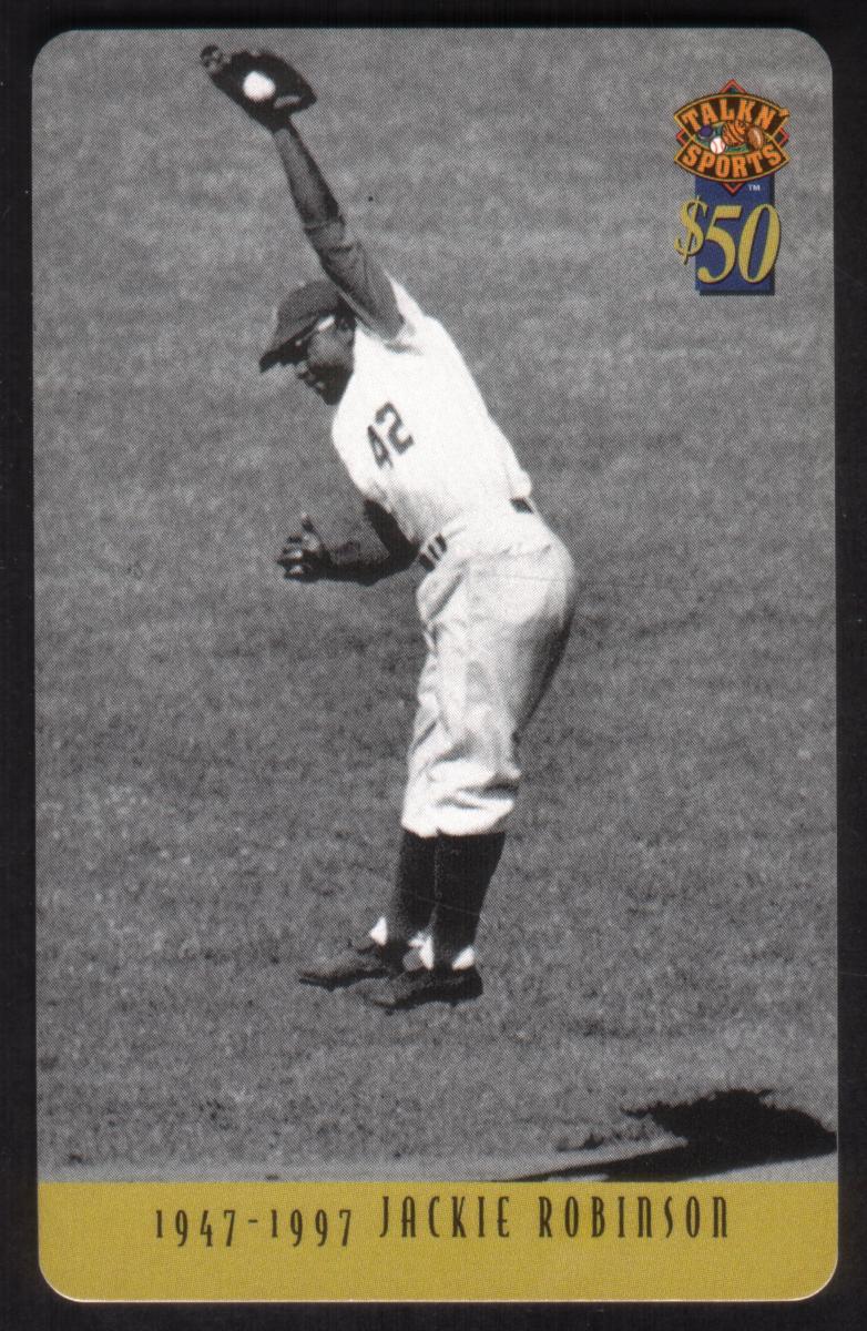 In the upper right corner of the card, there is a "Talk N' Sports" logo along with a "$50" denomination printed beneath it in gold and blue colors. At the bottom of the card, there is a gold strip containing the text "1947-1997 JACKIE ROBINSON" in black capital letters, commemorating the 50th anniversary of Robinson’s historic debut in Major League Baseball.