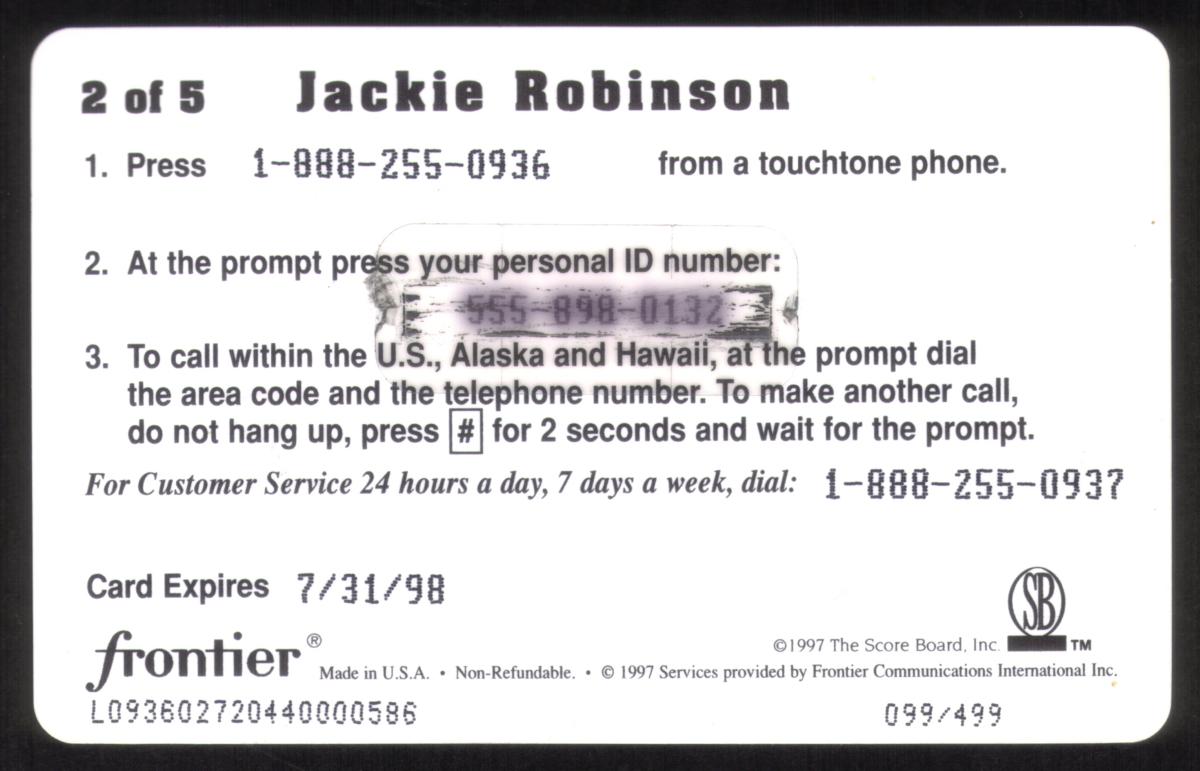 This collectible phone card features a black-and-white image of Jackie Robinson, wearing a baseball uniform with the number 42. He is captured in the middle of a dynamic play, reaching upward with his glove hand extended to catch a ball, with his left leg slightly bent and his right leg extended behind him. The background is a grass field, indicating an outdoor baseball game setting.