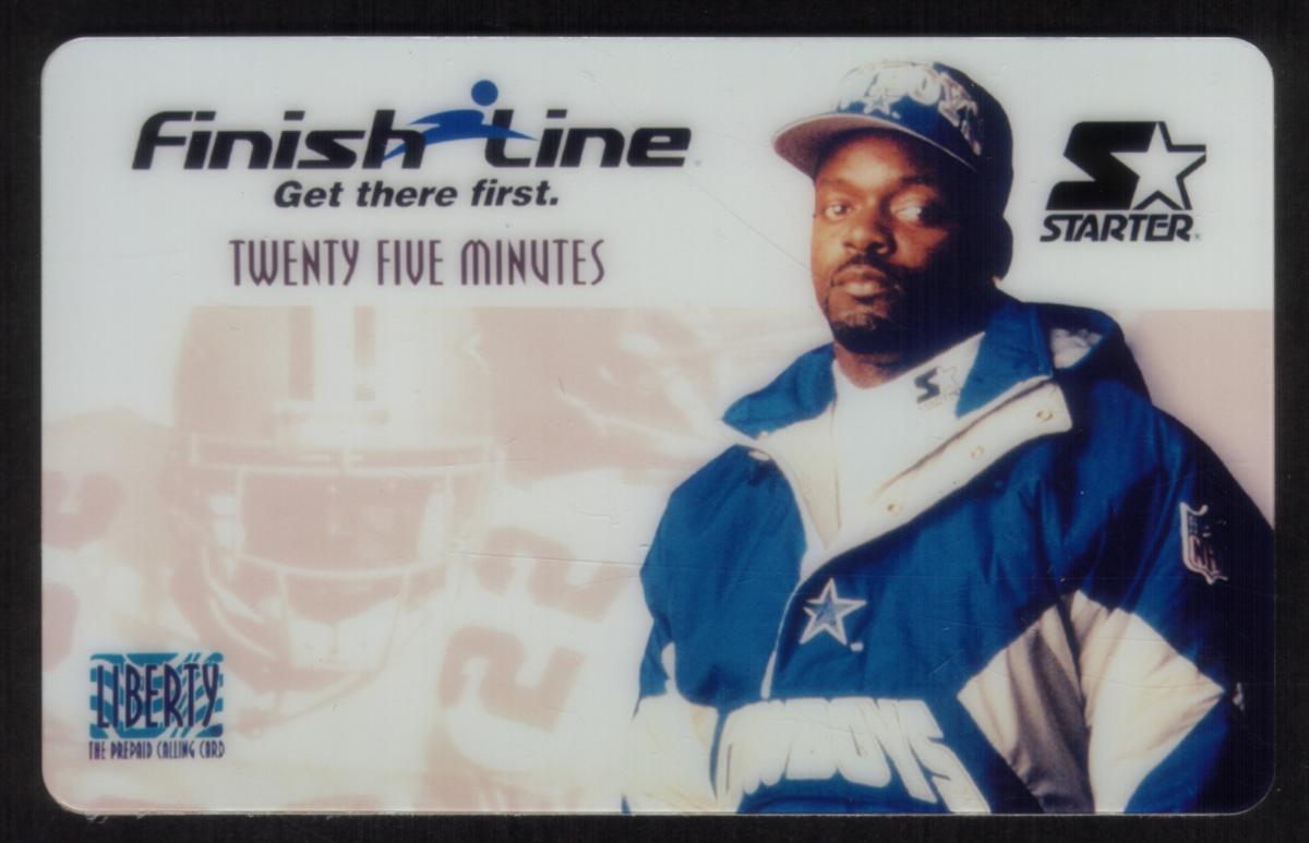 This collectible phone card features Emmitt Smith, the former Dallas Cowboys running back. Emmitt Smith is shown wearing a blue and white Dallas Cowboys Starter jacket and a matching Cowboys cap. He is positioned on the right side of the card, facing forward with a serious expression.