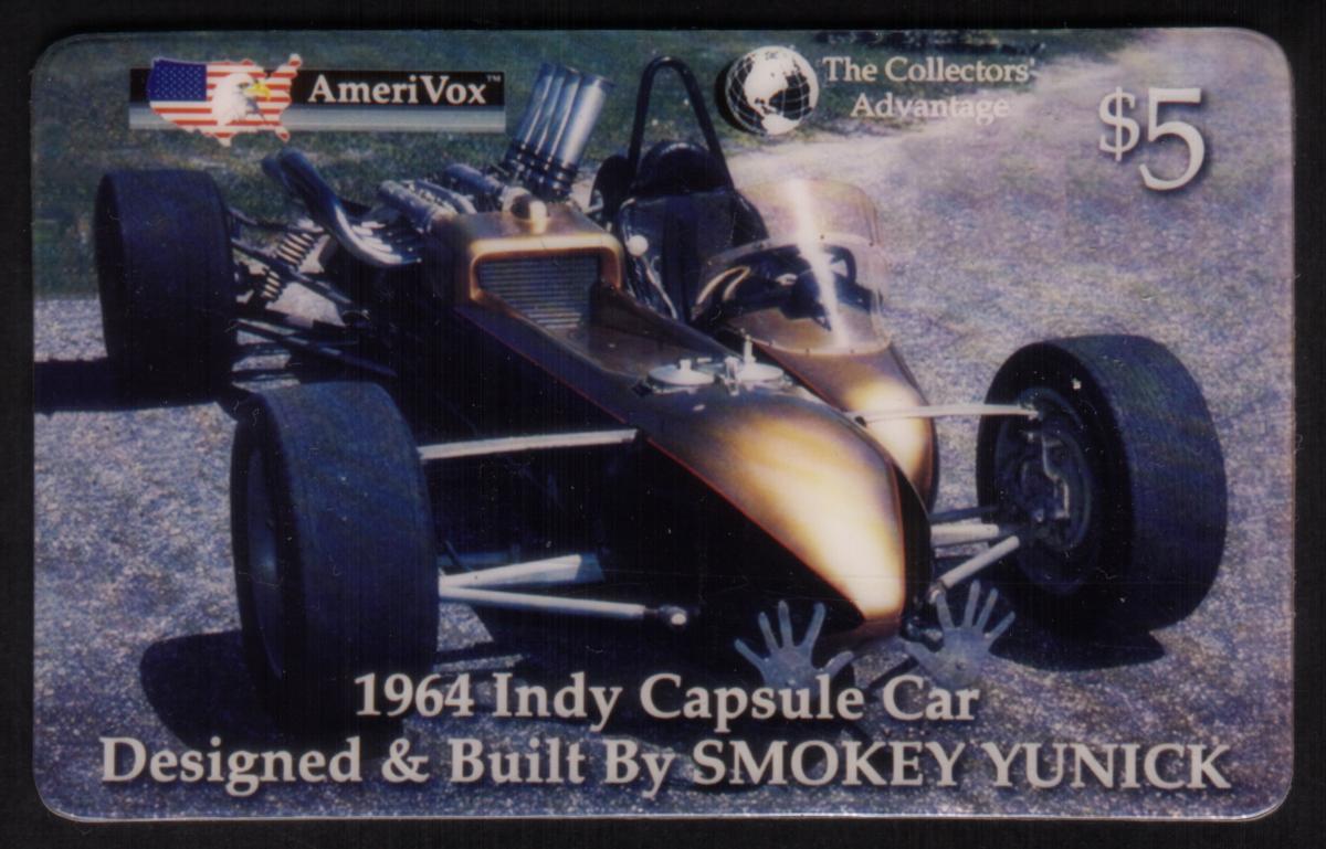 In the top left corner, the card displays the AmeriVox logo with an American flag stylized as a bird’s head. The top right corner features the text “The Collectors’ Advantage” alongside a globe icon and the denomination of $5. At the bottom center, the card prominently states: "1964 Indy Capsule Car Designed & Built By SMOKEY YUNICK." The entire design has a vintage racing theme centered on this notable automotive achievement.