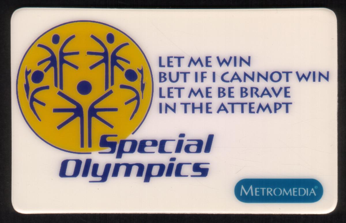 This card is associated with disability awareness and the spirit of inclusiveness through the Special Olympics movement, honoring bravery and perseverance in competition. It is identified as a promotional or complimentary item related to the Special Olympics, with keywords indicating its connection to differently abled individuals and the motivational ethos surrounding their efforts.