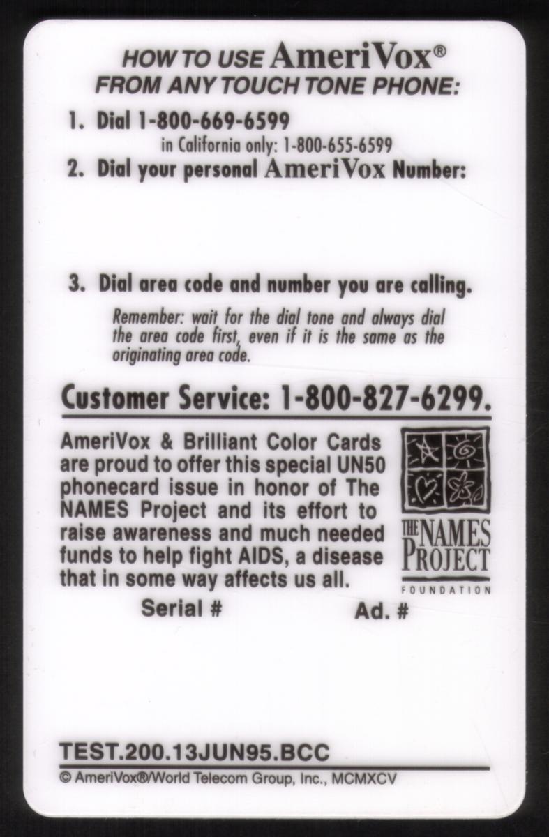 This phone card is associated with fundraisers and charities, reflecting efforts to raise awareness about virus and disease through the memorial project. It aligns with keywords including “fundraisers,” “symbols,” “quilts,” “memorials,” “charities,” “the names project,” “virus,” and “disease.” The overall design and text communicate the importance of remembering those affected by AIDS through a powerful and symbolic artistic medium.