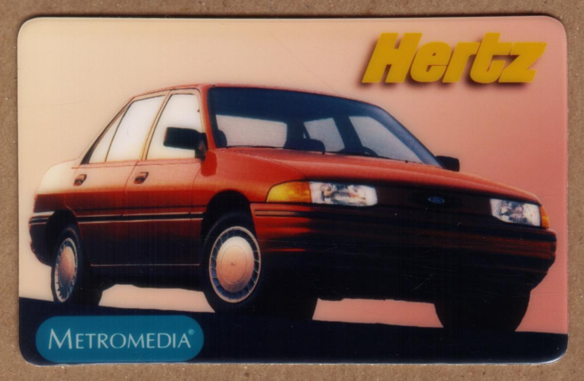 The card prominently displays the word "Hertz" in bold yellow letters at the top right corner, indicating its association with the Hertz Rent-A-Car company. At the bottom left corner, the logo "MetroMedia" is clearly visible in white text on a blue oval background, linking the card to MetroMedia. This card is identified by the keywords as related to "Promotional," "car rental," "MetroMedia," "ldds phonepass," "automobiles," "10u Hertz Rent-A-Car," "Metromedia (Ford Automobile)," "SPECIMEN," and "LDDS WorldCom."