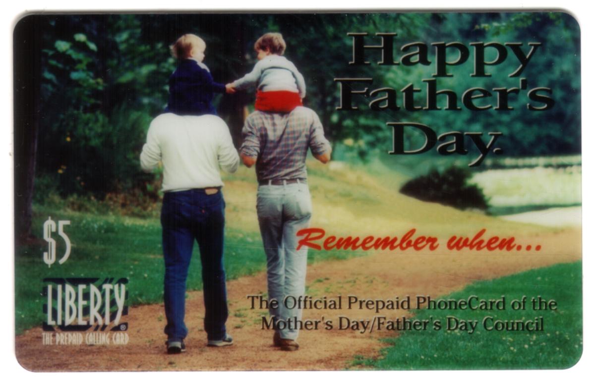 In the lower left corner, the card is marked with a $5 denomination and the Liberty logo, along with the words "The Phone Card Co." This prepaid phone card is officially endorsed by the Mother's Day/Father's Day Council, as stated below the red script on the right side. The overall design captures a nostalgic and warm celebration of Father's Day and the bond between fathers and their children, set amid a natural park setting.