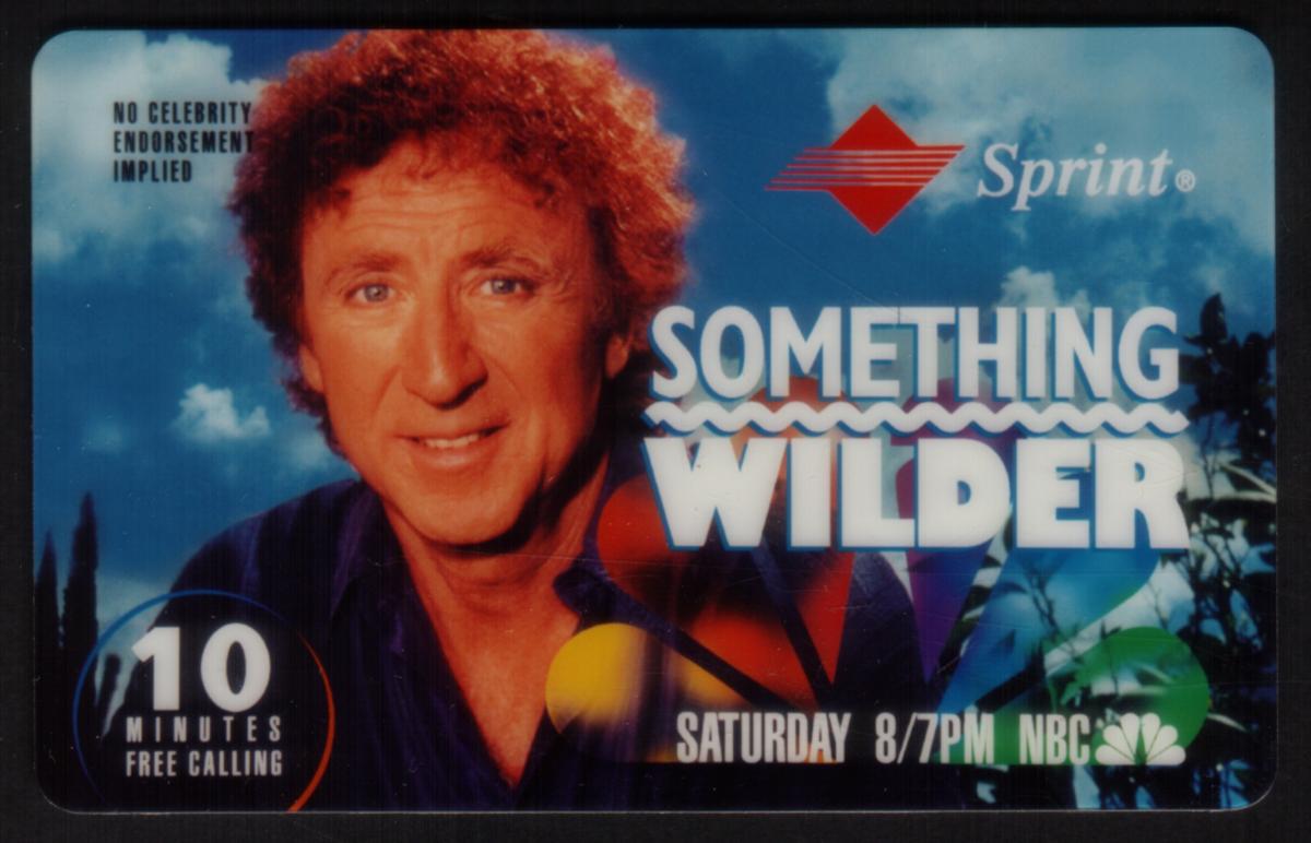 This collectible phone card features a close-up photographic image of actor Gene Wilder with a blue sky and clouds background. The card promotes the NBC television show "Something Wilder," which aired on Saturdays at 8/7 PM on the NBC network. The Sprint logo is displayed prominently in the upper right corner.