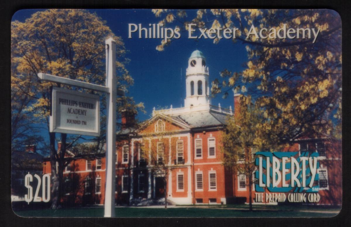 This collectible phone card features a photograph of Phillips Exeter Academy, a prestigious boarding school located in New Hampshire. The image is taken during daylight with a clear blue sky as a backdrop. The main building showcased is a large red brick structure with white columns and detailed architectural elements. At the top center of the building, there is a prominent white cupola with a clock.