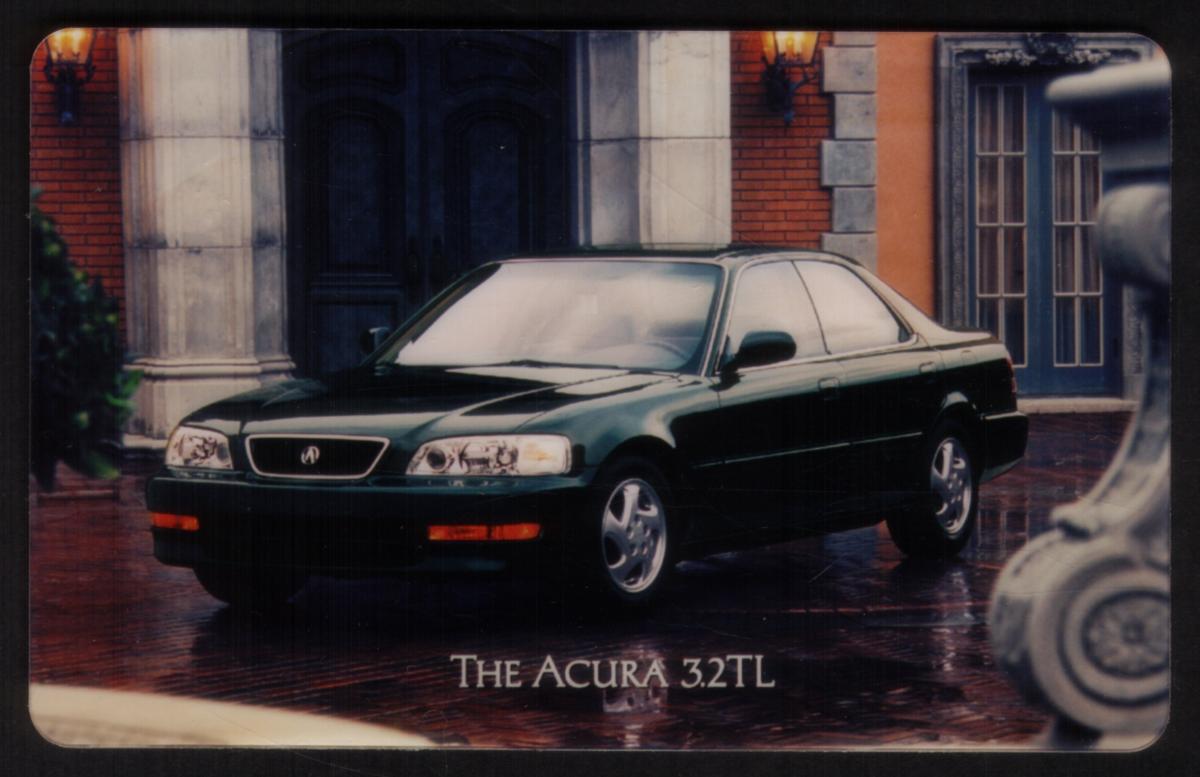 This collectible promotional card features a detailed image of a dark green Acura 3.2TL automobile parked on a polished brick driveway in front of a stately building entrance. The setting includes large double wooden doors framed by stone pillars and brick walls, illuminated by classic-style wall lamps on either side. The text "THE ACURA 3.2TL" is displayed prominently near the bottom center of the card.