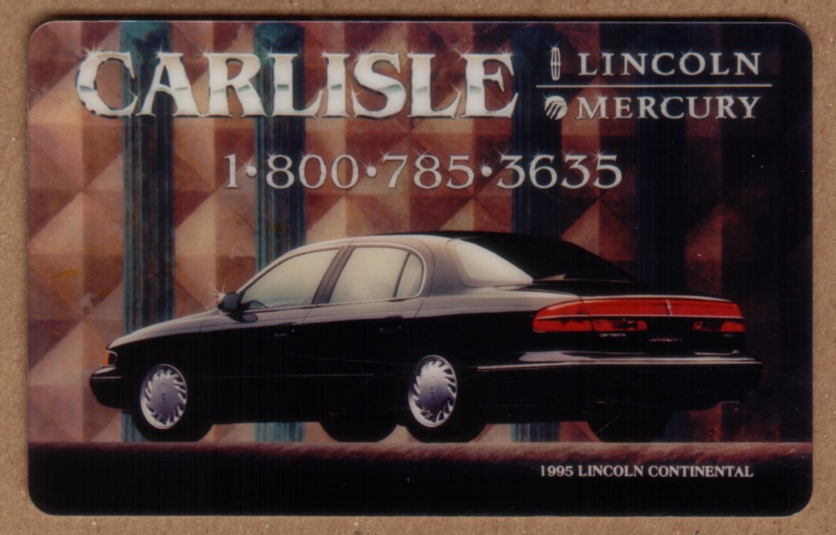 This collectible promotional card from Carlisle Lincoln Mercury features a photograph of a black 1995 Lincoln Continental automobile displayed in profile against a geometric, reddish-brown background with vertical columns. The top portion of the card prominently displays the text "CARLISLE Lincoln Mercury" in large white letters with a vertical bar separating the two brand names. Below the dealership name is a phone number, "1-800-785-3635," presented in white text.