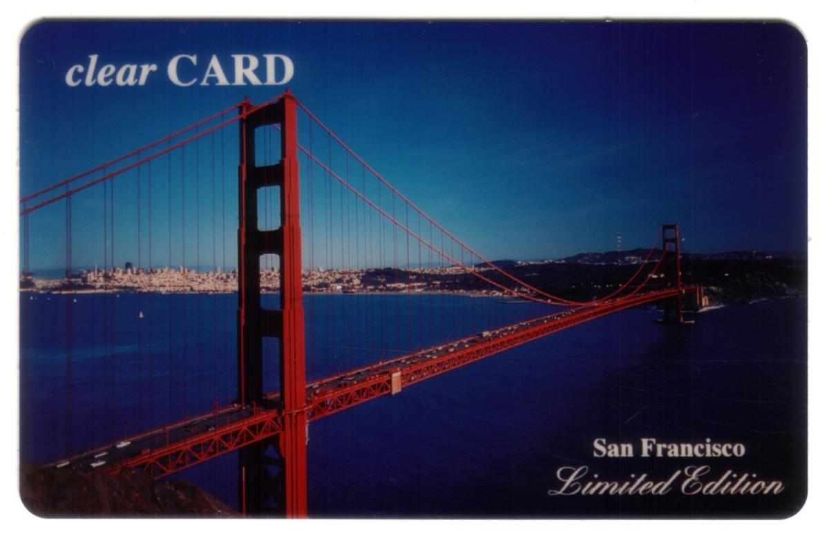 The card includes text in the upper left corner that reads "clear CARD" in white font. In the lower right corner, the words "San Francisco Limited Edition" appear in elegant white script, emphasizing the collectible and special nature of this card. The scene captures the bridge during daylight with clear weather, highlighting the detailed structure and suspension cables.