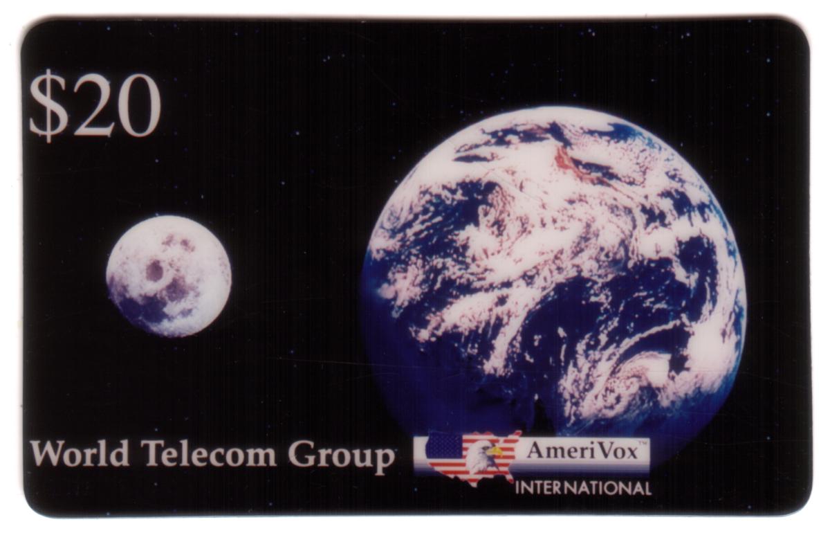 The design emphasizes space exploration themes with the visual focus on Earth, the Moon, and outer space. This card is tied to World Telecom Group and AmeriVox, both names shown clearly on the card's front face.
