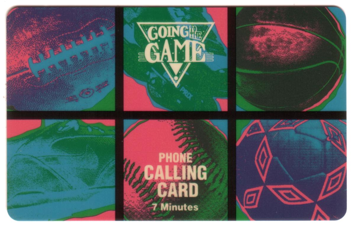 Sports-themed phone card featuring vibrant images of baseball, football, basketball, soccer, and tennis balls in a bold, pop-art style. |