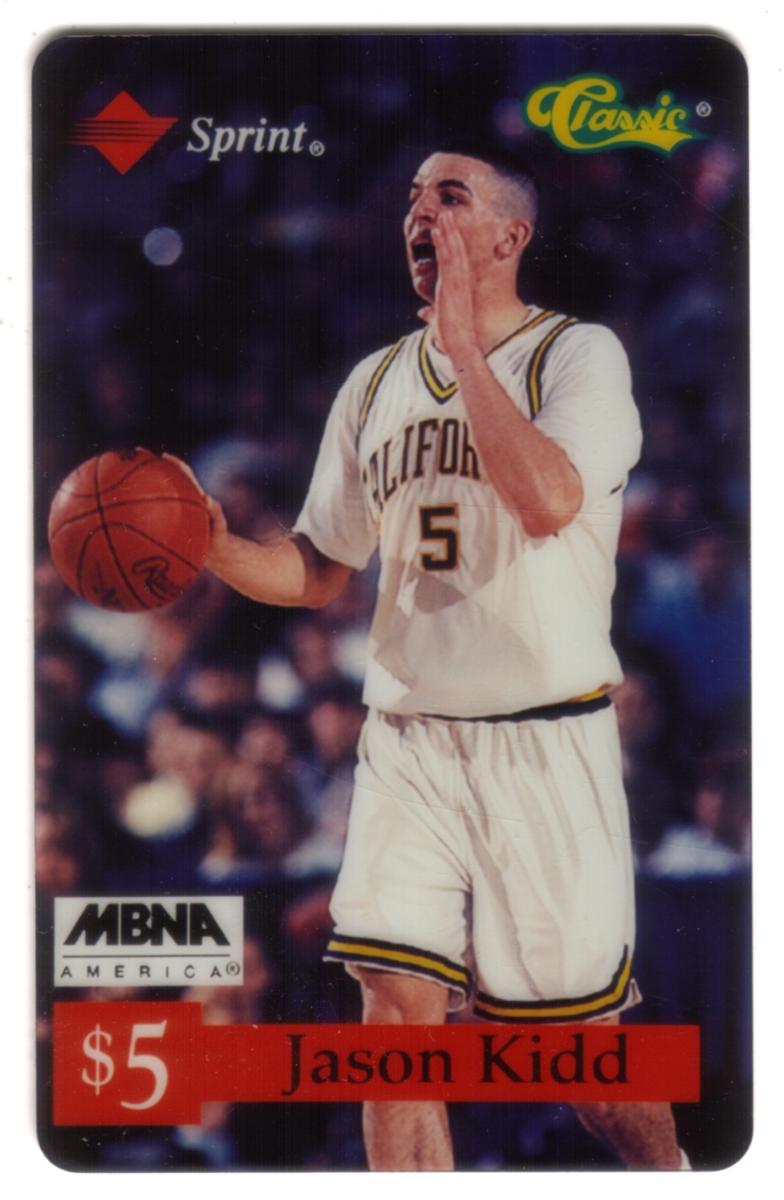 This phone card is associated with the NBA and basketball themes, featuring prominent bank branding from MBNA America, and Sprint as a telecommunication sponsor. The overall design highlights Jason Kidd as a key figure, emphasizing basketball and corporate collaboration.