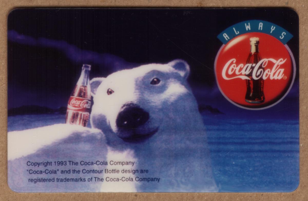 This phone card was issued by Quest Group Internatl in 1994 and aligns with collectible cards highlighting Coca-Cola advertising history. The artwork highlights the polar bear as a recognizable mascot for Coca-Cola during this era, combined with classic logos and product imagery that reinforce the brand’s long-standing global appeal.
