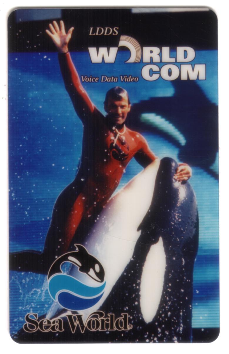 The card background is a deep blue, resembling an aquatic theme, with the text "LDDS WorldCom" prominently displayed near the top in white and light tan letters. Beneath the WorldCom logo, the phrase "Voice Data Video" appears in smaller gold lettering. At the bottom left corner, there is a circular SeaWorld logo featuring a stylized orca whale leaping over blue waves, accompanied by the word "SeaWorld" in a coral-colored script font.