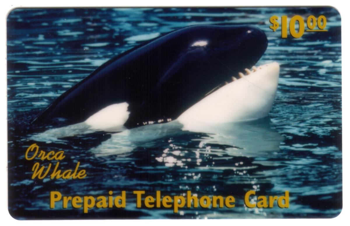 Golden yellow text appears on the card. In the upper right corner, it displays the value of the card as "$10.00". The bottom portion of the card reads "Prepaid Telephone Card" in large, bold letters, and to the left in cursive script, the words "Orca Whale" are written. The design emphasizes the natural beauty of marine life while clearly indicating the card’s function as a prepaid telephone medium.