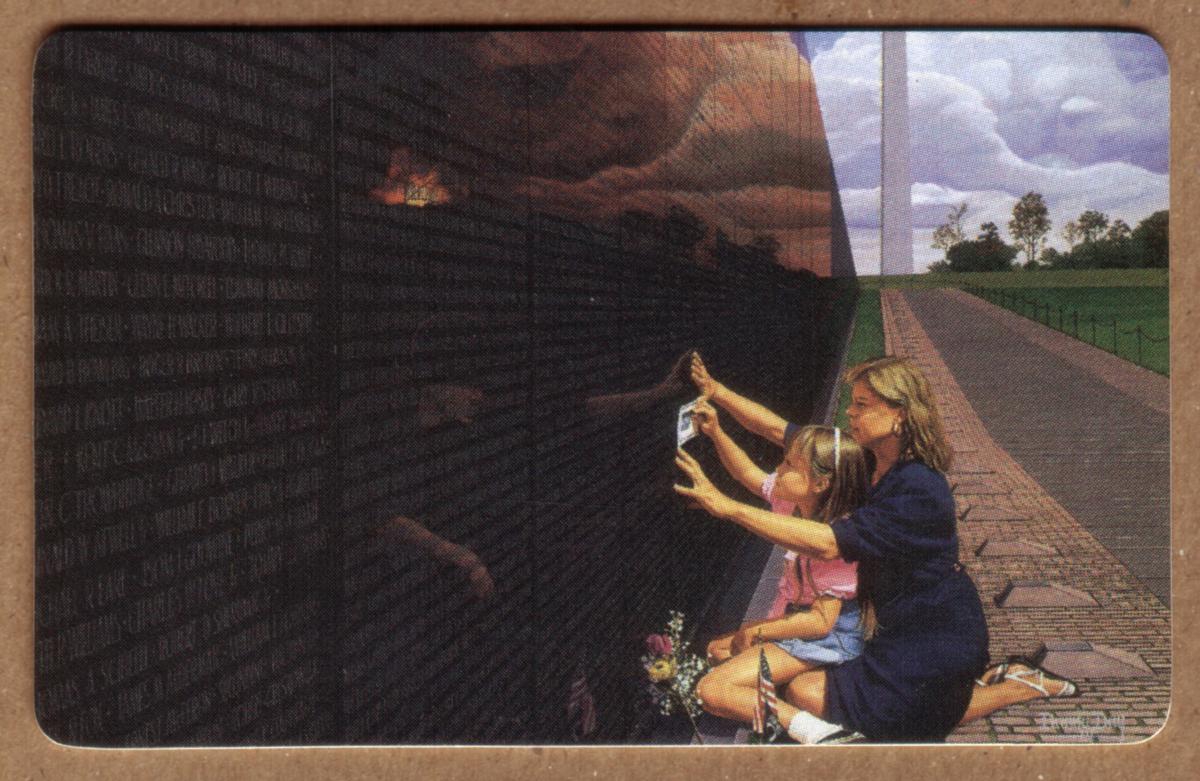 This card commemorates the Vietnam War Wall Experience through a respectful and heartfelt representation, combining important American landmarks with a touching personal moment. It was produced by 8th Avenue Graphics of Alta Loma, California, and is issued by Phone Cards, Inc. with a value of $12.00.