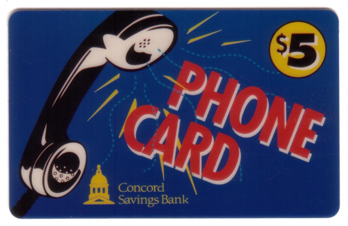 The design incorporates the Quest Group International’s large telephone handset SPECIMEN theme, emphasizing the card’s use and its promotional connection to Concord Savings Bank, a financial institution engaged in banking services. The combination of the bank’s logo and the phone card denomination highlights this card’s dual function as a collectible promotional item and a prepaid phone card valued at five dollars.
