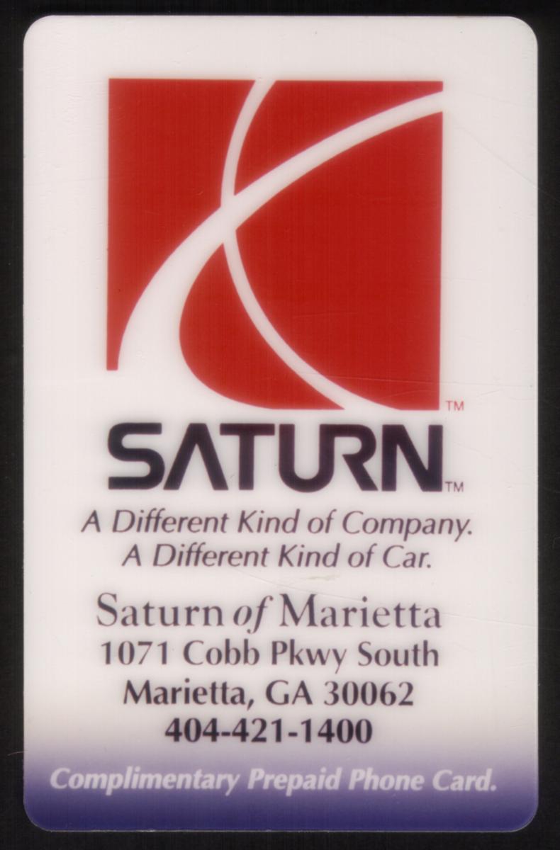 This promotional phone card is connected to the automobile industry, specifically highlighting the Saturn brand and the Marietta, Georgia dealership location.
