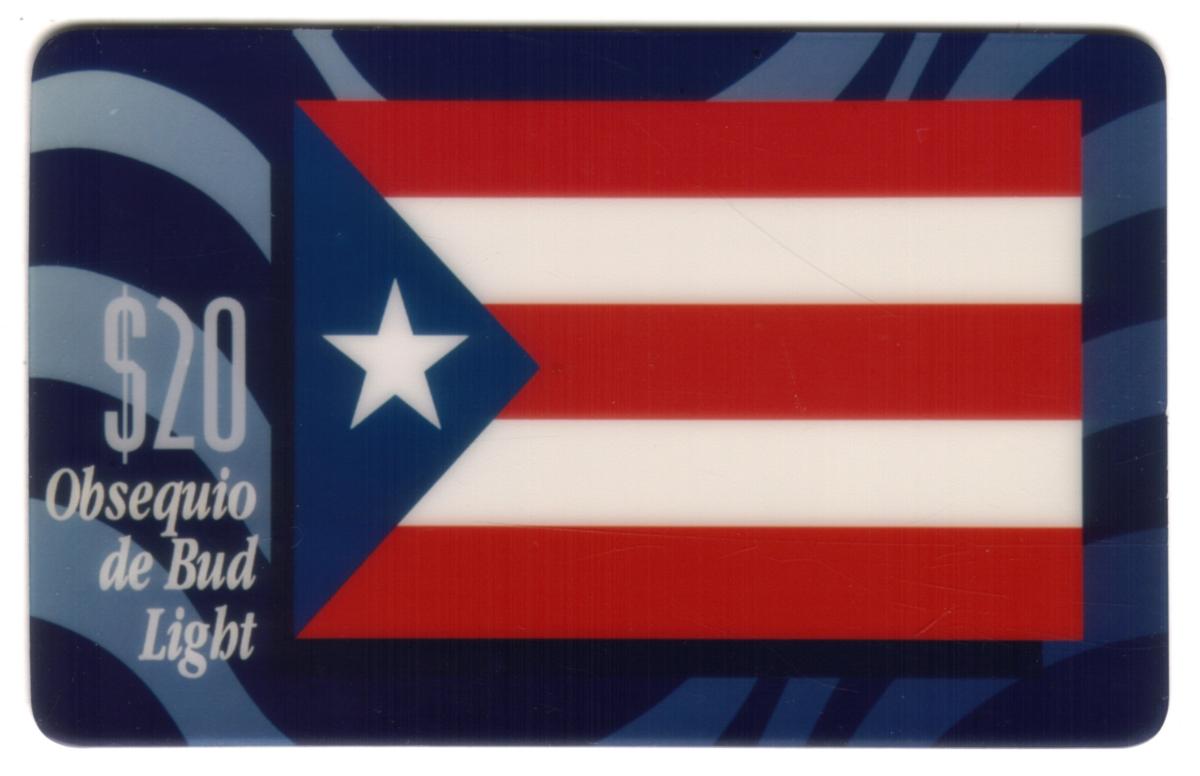 The card clearly represents a promotional collectible item celebrating the Puerto Rican flag and American territories, linking to beverages and liquors, specifically Bud Light beer.