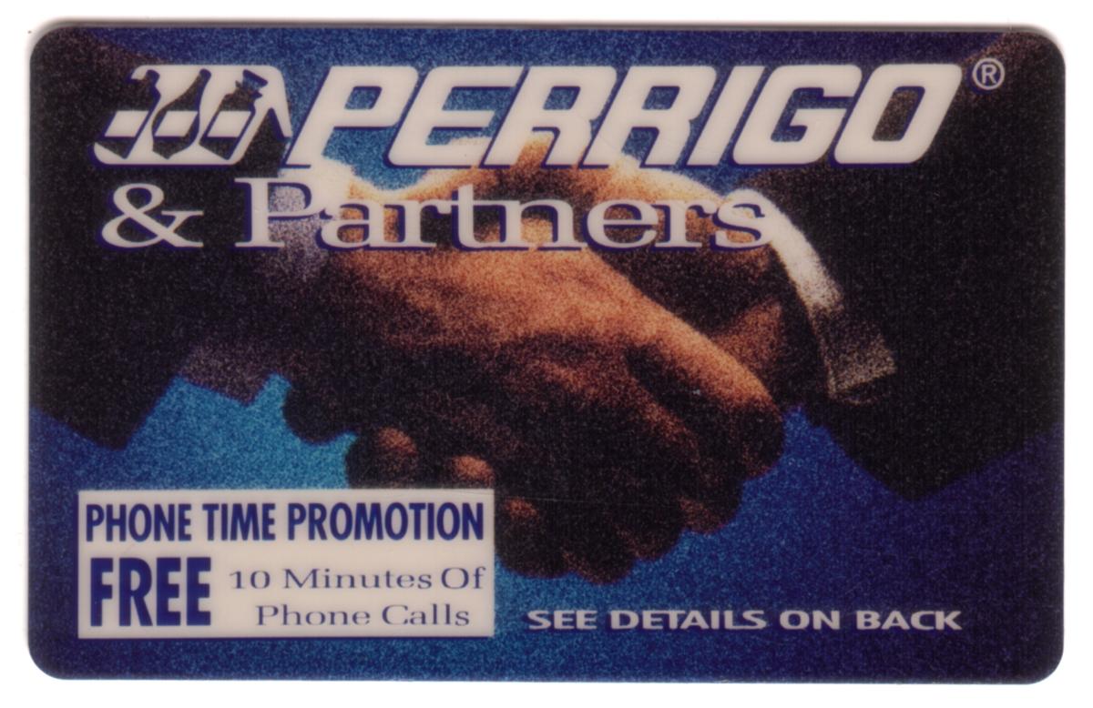 Overall, the card combines branding and promotional messaging to present Perrigo & Partners as a reputable entity while offering 10 free minutes of phone calls, making it a practical collectible phone card for users.