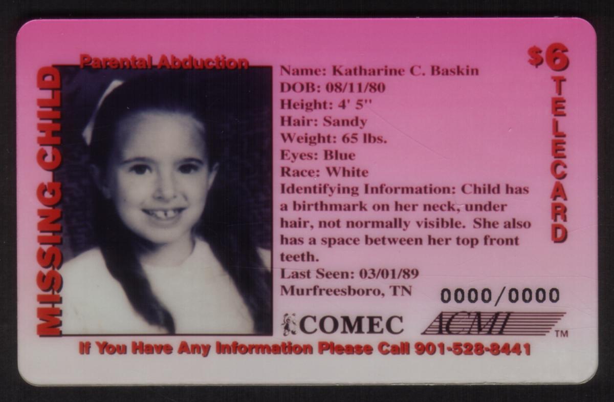 The card states that Katharine C. Baskin was last seen on March 1, 1989, in Murfreesboro, Tennessee. The card is designated for use in parental abduction cases and is issued by COMEC. It carries a value of $6 and is identified as a "STELECARD." At the bottom of the card is a request for anyone with information about the child to call a provided phone number (901-328-8441).