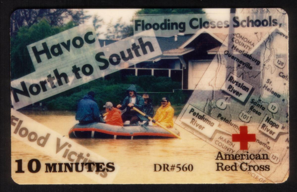 This collectible phone card highlights the impact of flooding in Northern and Southern California with a photographic image showing five people in a rubber raft navigating a residential neighborhood submerged in floodwater. The individuals are wearing rain gear, including jackets in colors such as blue, orange, and yellow. In the upper right corner, there is an inset map showing Sonoma County, Healdsburg, Guerneville, the Russian River, and other nearby locations. A prominent red cross symbol and the text "American Red Cross" appear near the map, indicating the involvement of this non-profit organization in flood relief efforts.