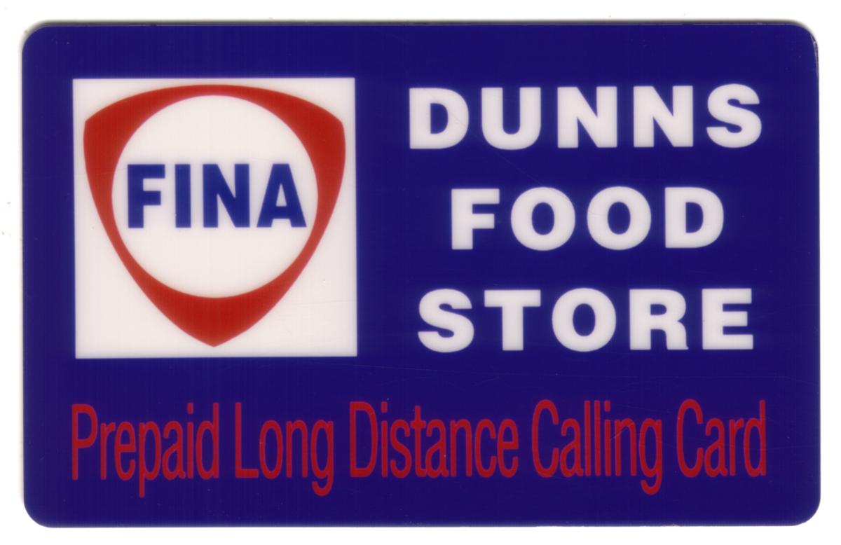Below the store name, the phrase "Prepaid Long Distance Calling Card" is displayed in red text, indicating the card’s specific use for prepaid long-distance phone calls. The card’s design is clean and straightforward, emphasizing the affiliation with the FINA gas station and Dunns Food Store. The combination of colors and fonts is designed for easy recognition.