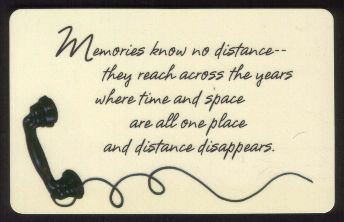 The main focus is an elegant, heartfelt message written in a flowing, script-style font that reads: "Memories know no distance -- they reach across the years where time and space are all one place and distance disappears." This message evokes themes of connection and timeless memories, fitting for the holiday season.
